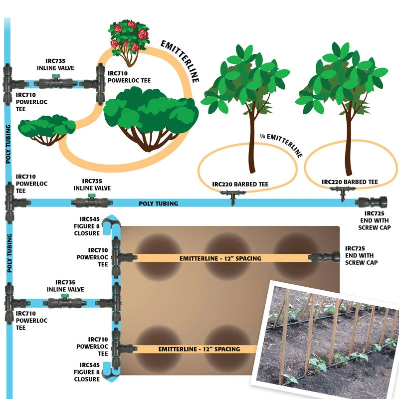 - Emitters: 12″ spacing; 1.0 GPH flow rate/emitter